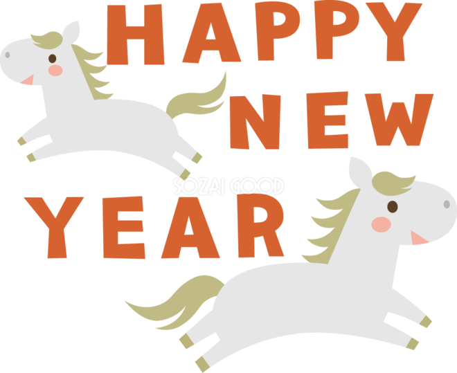 HAPPY NEW YEARの(文字・ロゴ)と2頭の走る白馬 かわいい 2026 午年イラスト 無料 フリー素材です。JPGやPNG画像の他に、Adobe Illustrator AI形式のベクターデータでもフリーです。