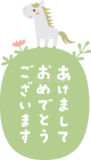 あけましておめでとうございますの(文字・ロゴ)が入った楕円の上に草花と白馬 かわいい 2026 午年イラスト 無料 フリー素材です。JPGやPNG画像の他に、Adobe Illustrator AI形式のベクターデータでもフリーです。
