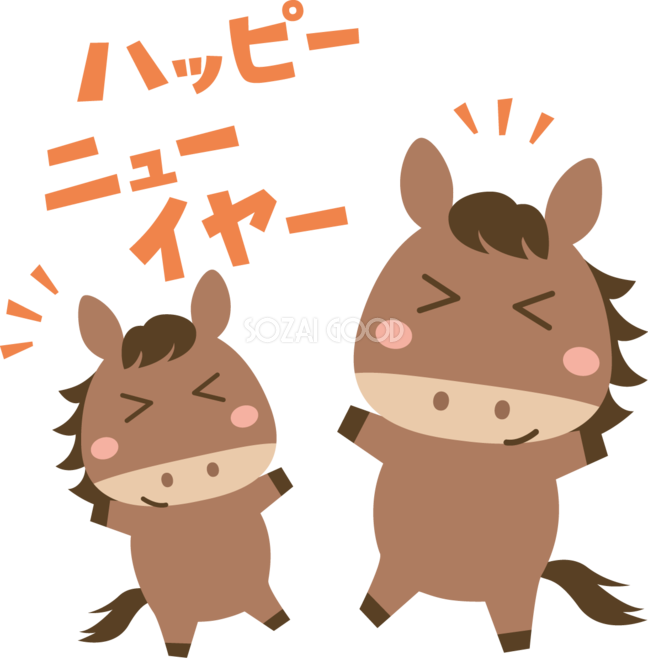 ハッピーーニューイヤー(文字・ロゴ)と言う親子の馬 かわいい 2026 午年イラスト 無料 フリー素材です。JPGやPNG画像の他に、Adobe Illustrator AI形式のベクターデータでもフリーです。