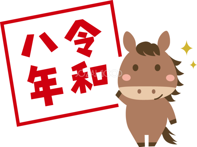 ハンコ風の令和八年(文字・ロゴ)と馬 かわいい 2026 午年イラスト 無料 フリー素材です。JPGやPNG画像の他に、Adobe Illustrator AI形式のベクターデータでもフリーです。