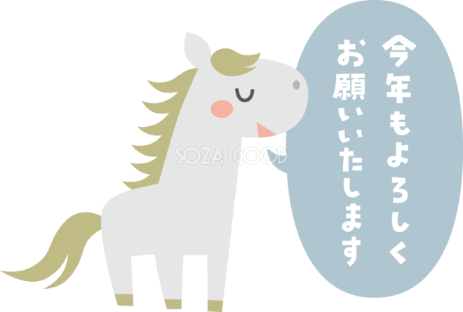今年もよろしくお願いいたします(文字・ロゴ)と言う白馬 かわいい 2026 午年イラスト 無料 フリー素材です。JPGやPNG画像の他に、Adobe Illustrator AI形式のベクターデータでもフリーです。