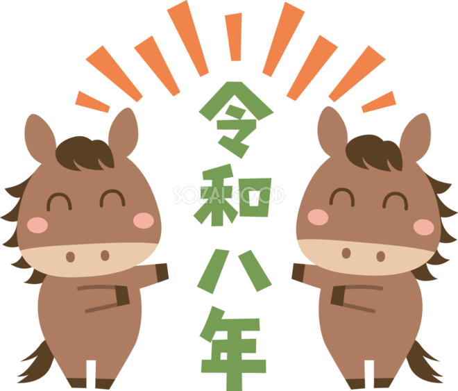 令和八年(文字・ロゴ)を紹介する2頭の馬 かわいい 2026 午年イラスト 無料 フリー素材です。JPGやPNG画像の他に、Adobe Illustrator AI形式のベクターデータでもフリーです。