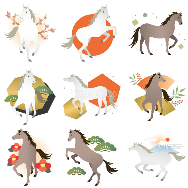 馬 かっこいい 2026 午年イラストセット素材集 無料 フリー素材です。JPGやPNG画像の他に、Adobe Illustrator AI形式のベクターデータでもフリーです。
