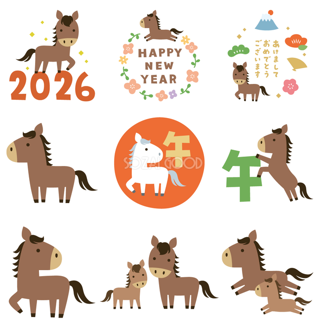馬 かわいい 2026 午年イラスト セット素材集 無料 フリー素材です。JPGやPNG画像の他に、Adobe Illustrator AI形式のベクターデータでもフリーです。