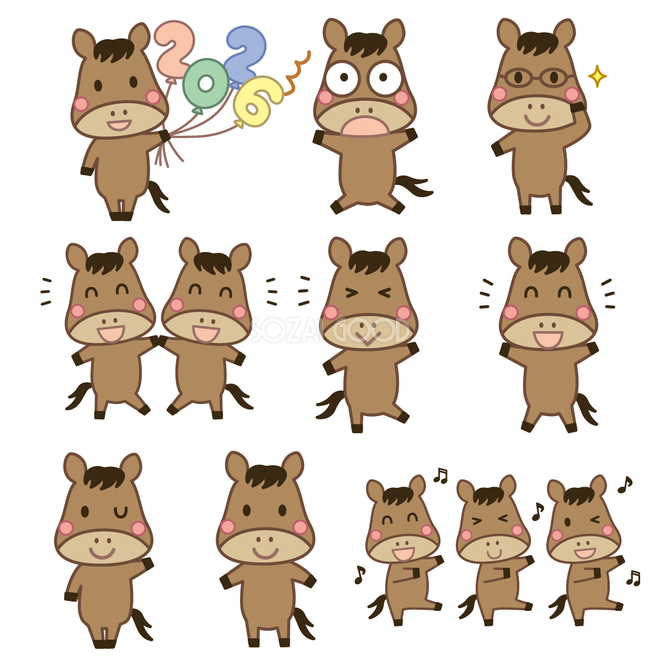 馬 かわいい 2026 午年イラスト セット素材集 無料 フリー素材です。JPGやPNG画像の他に、Adobe Illustrator AI形式のベクターデータでもフリーです。