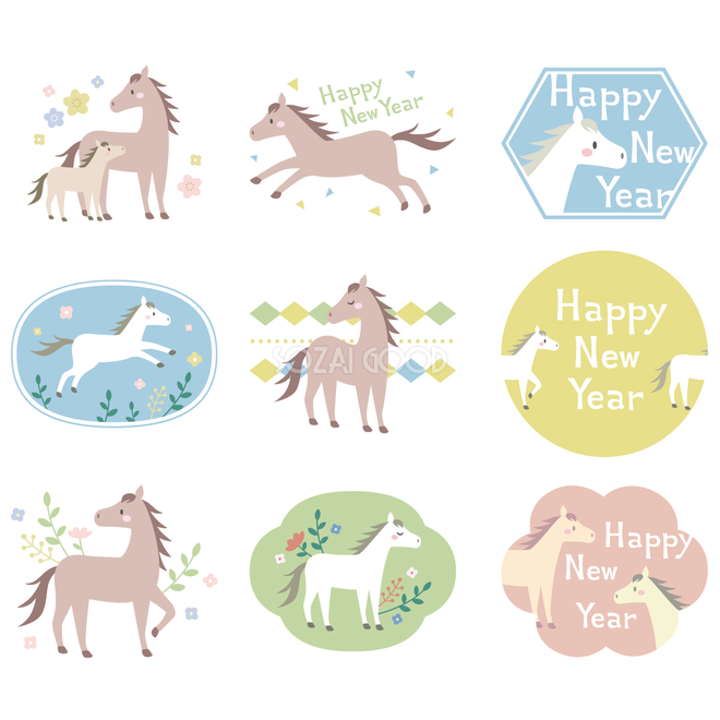 馬 おしゃれ 2026 午年イラスト セット素材集 無料 フリー素材です。JPGやPNG画像の他に、Adobe Illustrator AI形式のベクターデータでもフリーです。