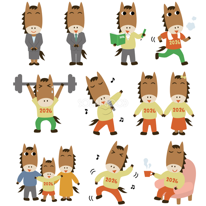 馬 ビジネス スーツ姿など 2026 午年イラスト セット素材集 無料 フリー素材です。JPGやPNG画像の他に、Adobe Illustrator AI形式のベクターデータでもフリーです。