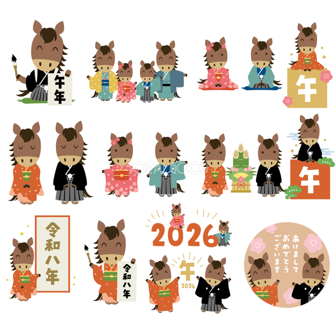 馬 着物 和風 かわいい 文字 ロゴ 2026 午年イラスト セット素材集 無料 フリー素材です。JPGやPNG画像の他に、Adobe Illustrator AI形式のベクターデータでもフリーです。
