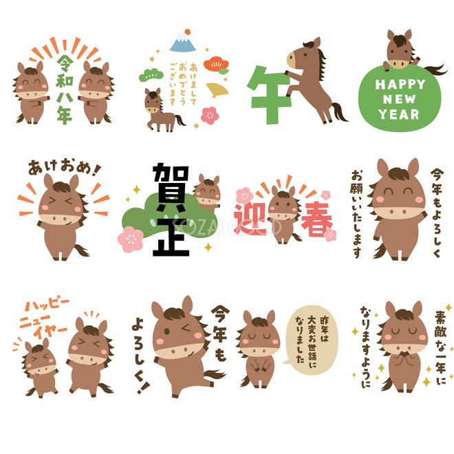 馬 かわいい 文字 ロゴ 2026 午年イラスト セット素材集 無料 フリー素材です。JPGやPNG画像の他に、Adobe Illustrator AI形式のベクターデータでもフリーです。