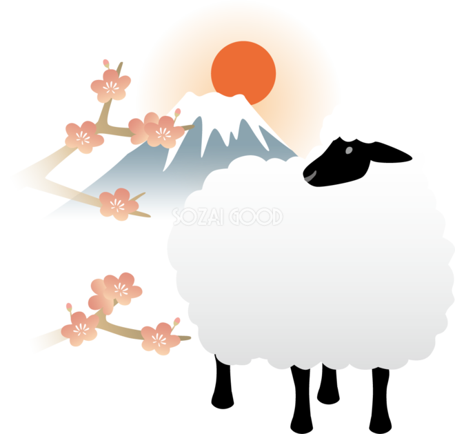 黒い羊と富士山と梅の枝 かっこいい 2027 未年イラスト 無料 フリー素材です。JPGやPNG画像の他に、Adobe Illustrator AI形式のベクターデータでもフリーです。