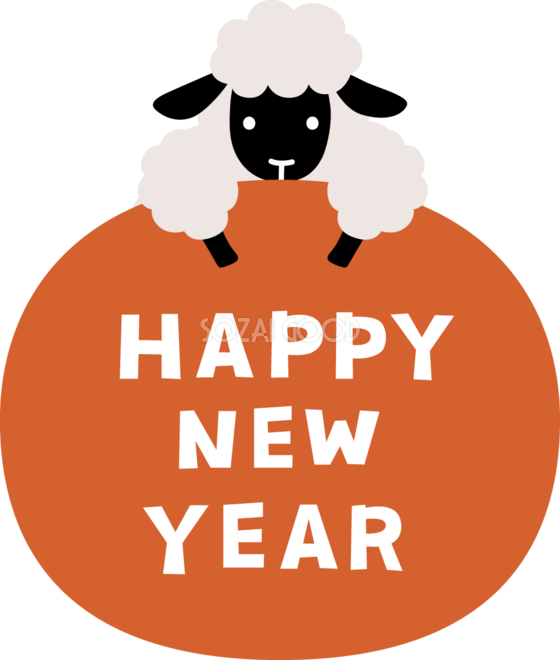 黒い羊が上から寄りかかった楕円の中にHAPPY NEW YEAR文字 ロゴ かわいい 2027 未年イラスト 無料 フリー素材です。JPGやPNG画像の他に、Adobe Illustrator AI形式のベクターデータでもフリーです。
