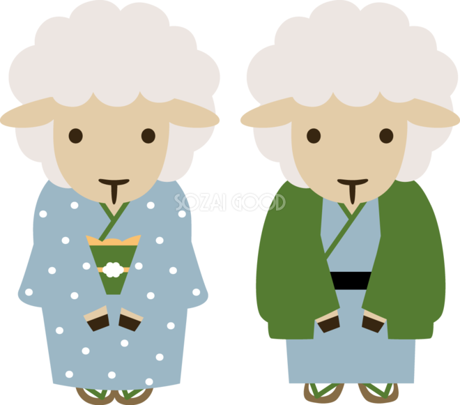 かわいい着物姿の立った男女の羊 2027 未年イラスト 無料 フリー素材です。JPGやPNG画像の他に、Adobe Illustrator AI形式のベクターデータでもフリーです。