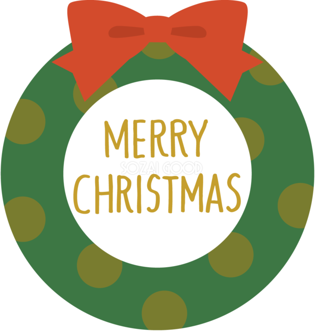 クリスマスリースの中にMERRY CHRISTMASのロゴ かわいい 文字 イラスト 無料 フリー素材です。JPGやPNG画像の他に、Adobe Illustrator AI形式のベクターデータでもフリーです。