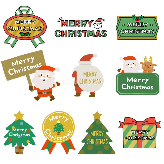 Merry Christmas(メリークリスマス) 文字 ロゴ サンタクロース セット素材集 無料 フリー素材です。JPGやPNG画像の他に、Adobe Illustrator AI形式のベクターデータでもフリーです。
